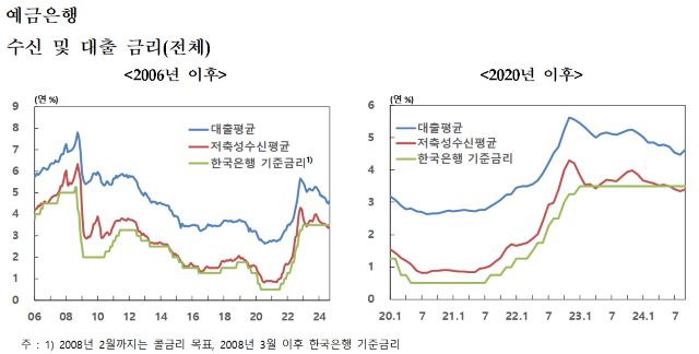 31일 한국은행이 발표한 ‘2024년 9월 금융기관 가중평균금리’에 따르면 9월중 신규취급액 기준 저축성수신금리는 연 3.40%로 전월 대비 0.05%p 상승했다. 대출금리는 연 4.62%로 전월 대비 0.14%p 상승했다.