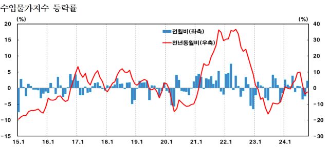 13일 한국은행이 발표한 ‘2024년 10월 수출입물가지수 및 무역지수’에 따르면 10월 수입물가는 전월 대비 2.2% 상승했다. 같은 기간 수출물가는 1.7% 올랐다.