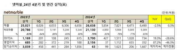 (서울=NSP통신) 이복현 기자 = 넷마블(대표 권영식, 김병규)은 작년 4분기 연결기준으로 매출 6490억원(YoY -2.5%, QoQ 0.3%), EBITDA(상각전 영업이익) 734억원(YoY 19.3%, QoQ -28.6%), 영업이익 352억원(YoY 87.2%, QoQ -46.3%), 당기순손실 1667억원(YoY 적자지속, QoQ 적자전환)을 기록했다고 밝혔다.