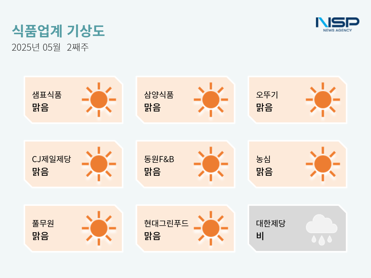 (서울=NSP통신) 옥한빈 기자 = 2025년 5월 2주차 식품업계기상도는 농심, 삼양식품, 오뚜기, CJ제일제당, 동원F&B, 풀무원, 현대그린푸드, 샘표식품의 ‘맑음’, 대한제당의 ‘비’로 기록됐다.