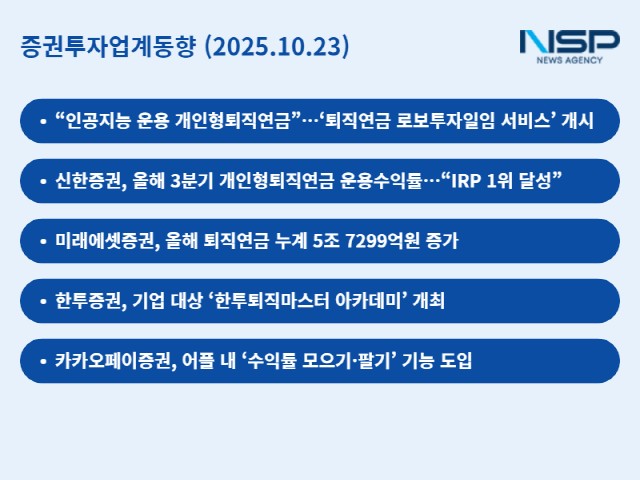 (서울=NSP통신) 임성수 기자 = 증권업계가 2025년 3분기 퇴직연금 비교공시와 함께 고객들의 퇴직연금 수요에 맞춰 자사의 경쟁력을 입증하고 있다. 증권사들은 인공지능(AI) 운용, 공시 집계를 통한 자사 경쟁력 입증, 기업 퇴직연금 담당자 대상 세미나 등을 통해 퇴직연금 고객 수요를 충족하기 위해 노력하고 있다. 한편 모바일 앱 내 자동 매매 기능을 추가해 고객의 편익을 도모한 증권사도 존재한다.