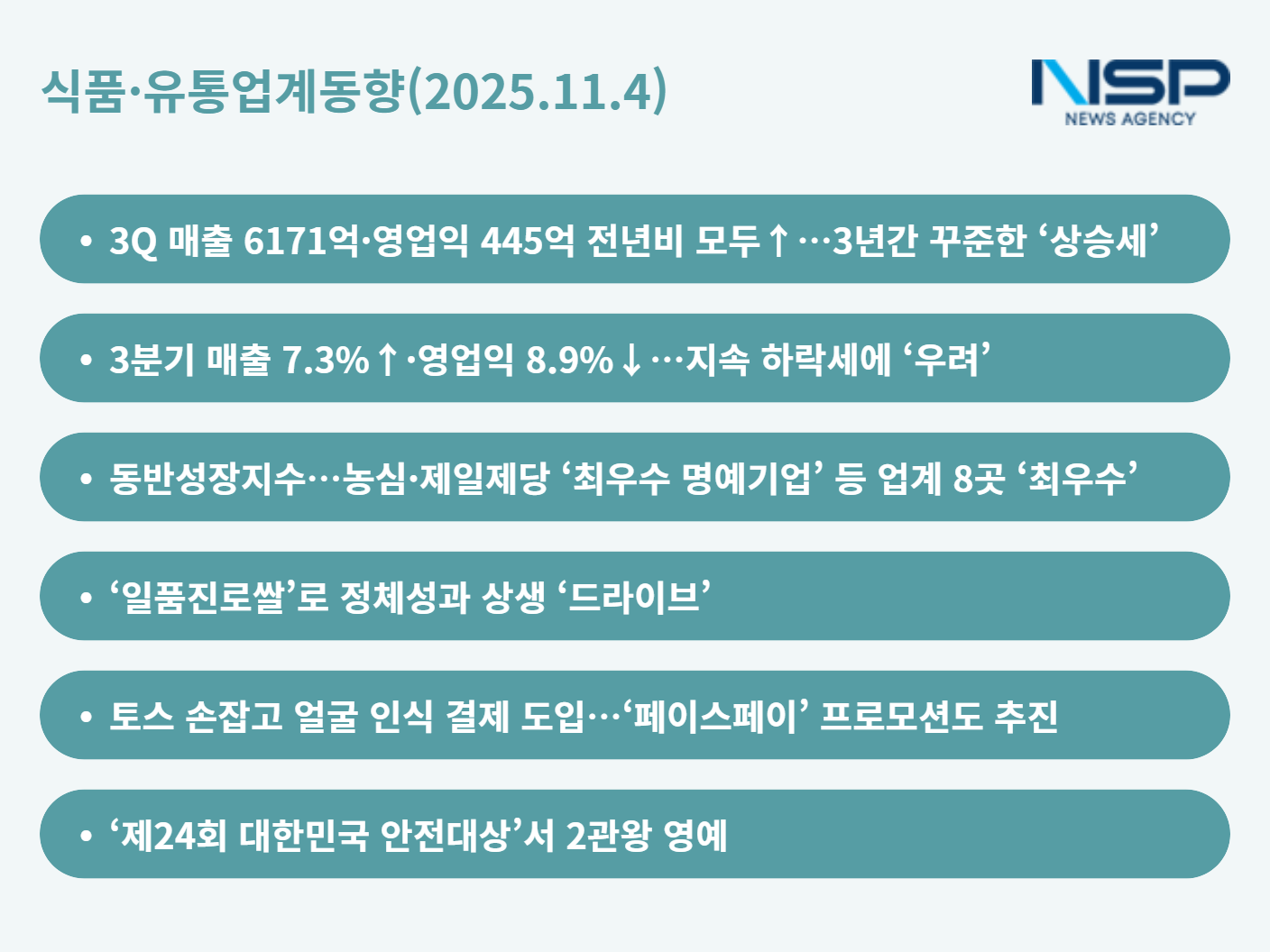 (서울=NSP통신) 옥한빈 기자 = 3분기 식품·유통업계 실적이 공개되며 기업 간 온도차가 뚜렷해졌다. 현대그린푸드는 3년 연속 안정적 성장세를 이어가며 내실형 기업으로 자리 잡았지만, 롯데웰푸드는 매출 증가에도 수익성이 악화되며 수익 구조 개선 과제가 남았다. 시장 성장률이 둔화된 가운데 ‘효율’이 각 기업의 생존 척도로 부상하는 모습이다. 한편 동반성장지수 평가에서는 농심과 CJ제일제당이 ‘최우수 명예기업’에 선정되며 업계의 모범 사례로 꼽혔다. 하이트진로는 자체 개발한 전용 쌀 품종으로 지역 농가 상생을, 현대면세점은 ‘페이스페이’ 도입으로 편의성을 강화했다. 롯데백화점은 안전 경영으로 정부 포상을 받으며 ESG 흐름에 발맞췄다. 실적의 명암은 갈렸지만 혁신과 책임을 중심으로 한 ‘질적 성장’이 업계 전반의 새 과제로 자리잡고 있는 모습이다.