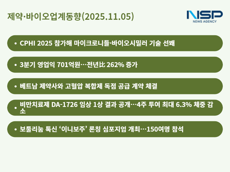(서울=NSP통신) 정송이 기자 = 제약·바이오업계가 글로벌 전시회 참가와 임상 성과 발표로 해외 시장 진출을 강화하고 있다. 혁신 기술 파트너링과 라이선스 계약 체결이 이어지며 신약 글로벌 상업화가 본격화되고 있다.