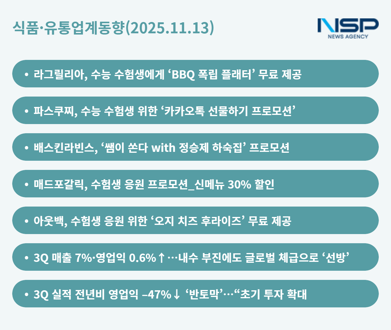 (서울=NSP통신) 옥한빈 기자 = 빼빼로데이 대목이 끝나자마자 수능이 끝나자 식품·외식 업계는 기다렸다는 듯 ‘수험생 모시기 대잔치’에 돌입했다. SPC는 라그릴리아·파스쿠찌·배스킨라빈스까지 삼각 편대를 꾸려 폭립부터 굿즈형 아이스크림까지 풀코스 혜택을 쏟아내며 사실상 수험생 전용 페스티벌을 열었다. 매드포갈릭과 아웃백도 할인·무료 메뉴로 가세하며 다이닝브랜즈까지 참전한 모양새다. 한편 성적표를 받아든 기업들의 표정은 갈렸다. 오리온은 내수 부진 속에서도 글로벌 시장에서 ‘멀티 플레이어’로 활약하며 웃었지만, 오아시스마켓은 초기 투자 확대의 후폭풍으로 영업이익이 반 토막 나 울상을 짓는 모습이다.