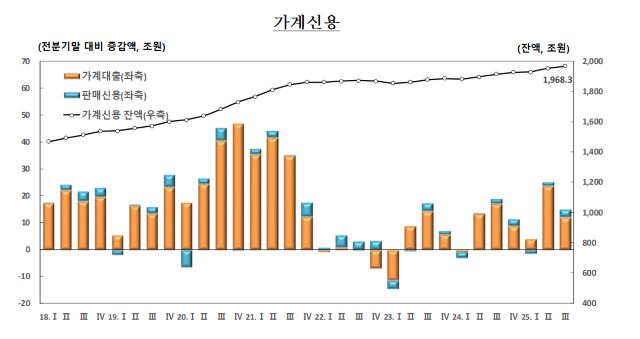 18일 한국은행이 발표한 ‘2025년 3분기 가계신용(잠정)’에 따르면 올 3분기 가계신용 잔액은 1968조 3000억원으로 전분기말 대비 14조 9000억원 증가했다. 가계신용은 금융기관 대출과 신용카드 결제금액 등을 포함한 금액이다.