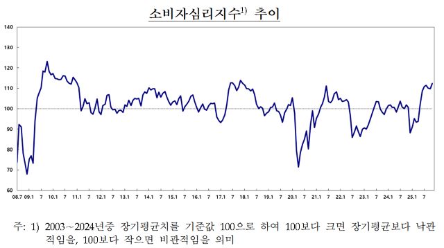 25일 한국은행이 발표한 ‘2025년 11월 소비자동향조사 결과’에 따르면 소비자들의 경제상황에 대한 심리를 종합적으로 나타내는 소비자심리지수(CCSI)는 11월중 112.4로 전월 대비 2.6p 상승했다. 지난 2017년 11월 이후 가장 높은 수준이다.