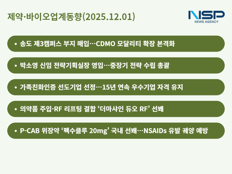 (서울=NSP통신) 정송이 기자 = 제약·바이오업계에서 생산시설 확장과 신제품 출시 소식이 잇따랐다. 임원 영입과 인증 획득 등 경영 강화 활동도 이어졌다. 기업들은 위탁개발생산(CDMO) 사업 확대와 제품 다각화를 통해 시장 경쟁력을 강화하고 지속가능경영 체계를 구축하고 있다.