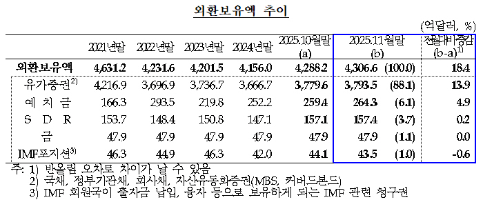 3일 한국은행이 발표한 ‘2025년 11월말 외환보유액’에 따르면 지난 11월말 우리나라의 외환보유액은 4306억 6000만달러로 전월말 대비 18억 4000만달러 증가했다. 한은은 “운용수익, 금융기관의 외화예수금이 증가한 영향”이라고 설명했다.