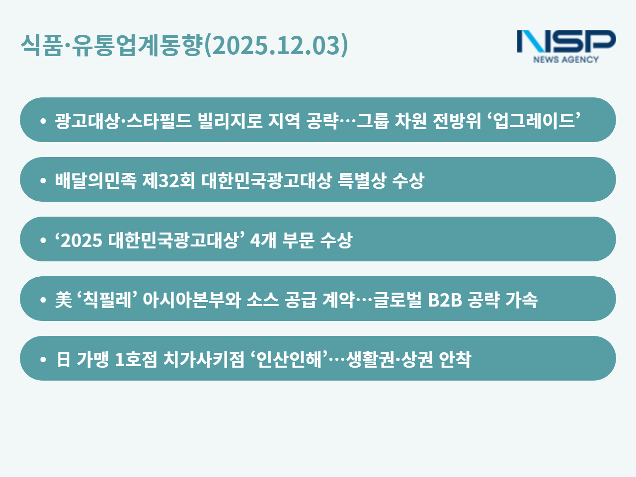 (서울=NSP통신) 옥한빈 기자 = 최근 신세계의 그룹차원 전방위적인 노력이 돋보인다. 오늘은 스타필드로 공간 브랜드 경쟁력을 끌어올렸다. 광고대상 OOH 부문 대상을 거머쥔 ‘세상에서 가장 큰 구조대원’ 캠페인에 이어, 파주 ‘스타필드 빌리지 운정’까지 열었다. 한편 외식·음료업계는 ‘광고의 힘’을 다시 증명했다. 배달의민족은 아이들의 ‘처음 맛난 날’을 담은 사회공헌 캠페인으로 특별상을 수상했고 롯데칠성음료는 4개의 브랜드가 동시에 수상하는 저력을 보여줬다. 글로벌 무대에서는 K-푸드가 더 거세다. 동원홈푸드는 美 칙필레와 손잡고 아시아 시장을 두드렸고 맘스터치는 일본 치가사키 첫 가맹점에서 오픈 첫날부터 줄 세우며 ‘생활권 K-버거’의 가능성을 증명했다. 업계 전반이 브랜드 경험·공간·글로벌 확장이라는 세 축에서 동시에 ‘순풍’을 맞는 분위기다.