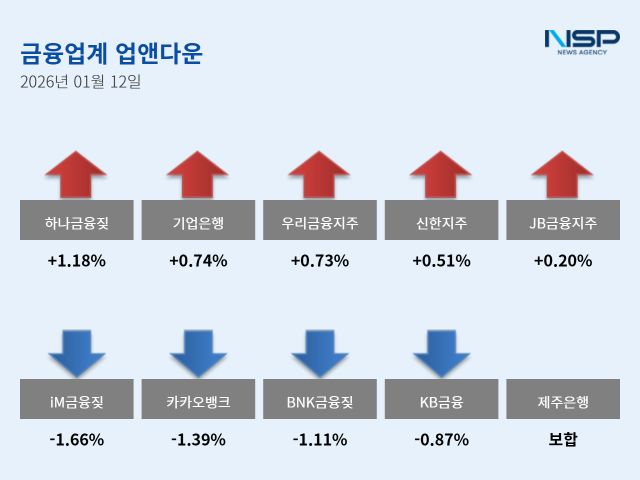 (서울=NSP통신) 강수인 기자 = 12일 코스피(+0.84%)와 코스닥(+0.20%)은 모두 상승한 가운데 은행주는 전거래일 대비 0.08% 상승했다. 은행주는 10종목 가운데 5종목이 상승, 4종목이 하락했다. 보합세는 1종목이다.