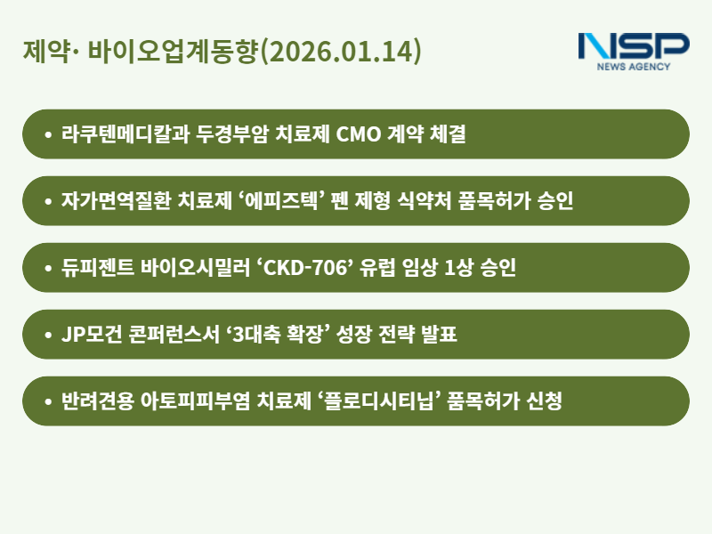 (서울=NSP통신) 정송이 기자 = 제약·바이오업계에서 해외 계약과 제품 허가, 임상 승인 소식이 잇따랐다. 삼성바이오로직스는 글로벌 생산능력 확장 전략을 발표했고 삼성바이오에피스는 에피즈텍 펜 제형 허가를 받았다. 롯데바이오로직스는 CMO 계약을 체결했으며 종근당과 대웅제약은 각각 임상 승인과 품목허가 신청 성과를 냈다.