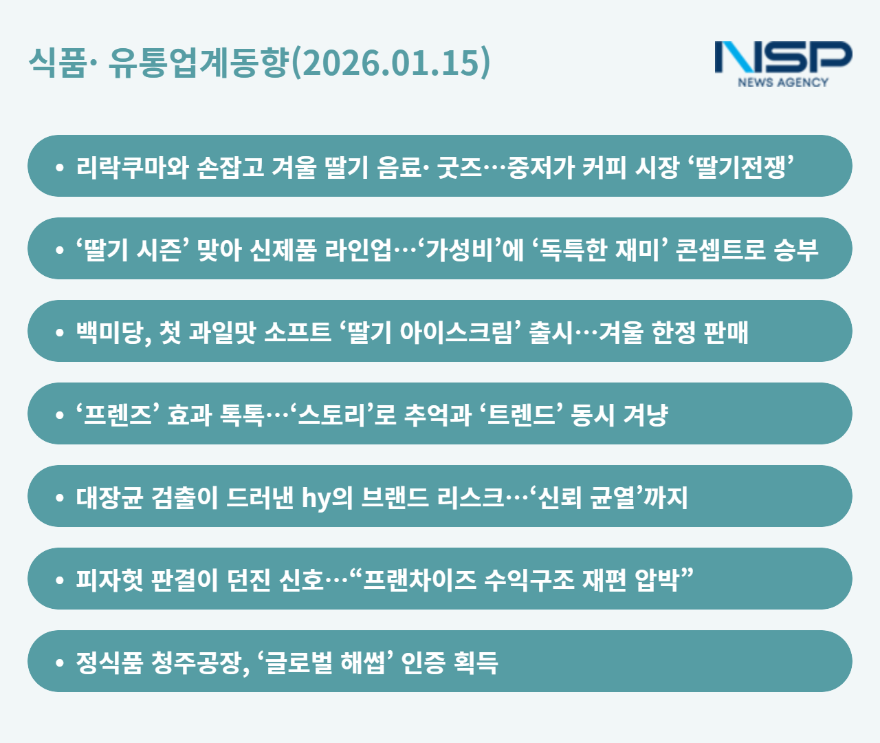 (서울=NSP통신) 옥한빈 기자 = 겨울 끝자락, 커피 시장은 ‘딸기’로 가장 먼저 봄을 불러냈다. 이디야·메가MGC·백미당이 각기 다른 가격대와 콘셉트로 딸기 신메뉴를 쏟아내며 중저가부터 프리미엄까지 계절 경쟁이 달아오르고 있다. 캐릭터 IP, SNS용 비주얼, 한정판 전략까지 동원되며 ‘딸기 전쟁’은 이제 맛을 넘어 경험 싸움으로 번지는 모양새다. 반면 식품·프랜차이즈 업계의 이면에서는 결코 가볍지 않은 경고음도 울린다. hy는 대장균 검출로 ‘건강 브랜드’의 신뢰 관리가 얼마나 치명적인 변수인지 드러냈고 피자헛 판결은 프랜차이즈 수익 구조 전반에 재편 압박을 던졌다. 한쪽에서는 계절과 트렌드를 쫓아 질주하고 다른 한쪽에서는 리스크 관리의 민낯이 드러난 하루다.