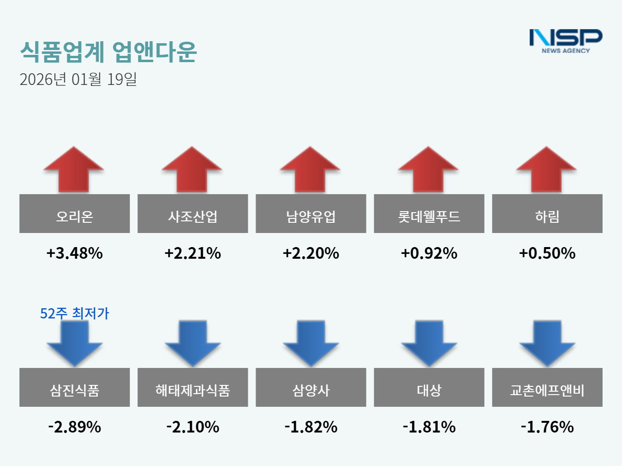 교촌에프앤비는 전거래일 대비 1.76%(75원) 하락해 4195원으로 장을 마쳤고 대한제분은 전거래일 대비 1.68%(2400원) 하락해 14만100원으로 장을 마감했다.