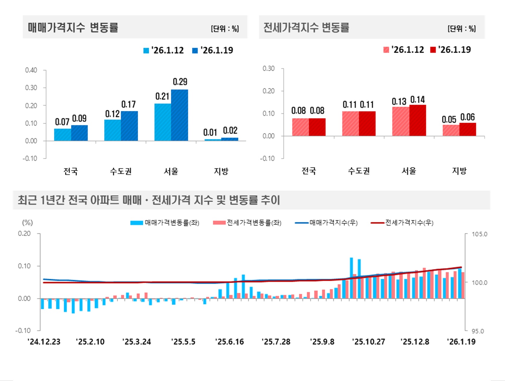 한국부동산원이 발표한 ‘2026년 1월 셋째주(1월 19일 기준) 전국 주간 아파트가격 동향’에 따르면 전국 아파트 매매가격은 전주 대비 0.09% 상승했다. 전세가격도 0.08% 올라 상승 흐름을 유지했다.