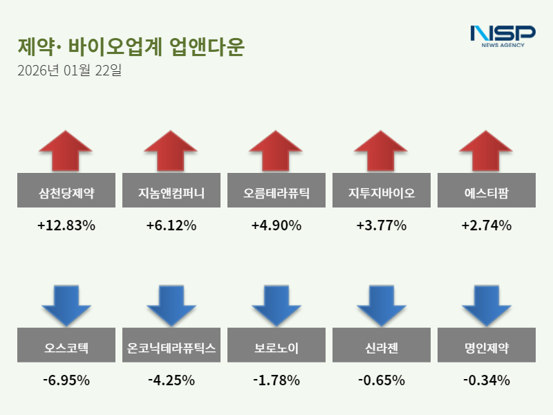 (서울=NSP통신) 정송이 기자 = 22일 코스피(+0.87%), 코스닥(+2.00%) 모두 상승했다. 이 가운데 제약주는 전거래일 대비 0.12% 하락했다. 제약주는 172종목 가운데 102종목이 상승, 48종목이 하락했다. 보합세는 22종목이다.
