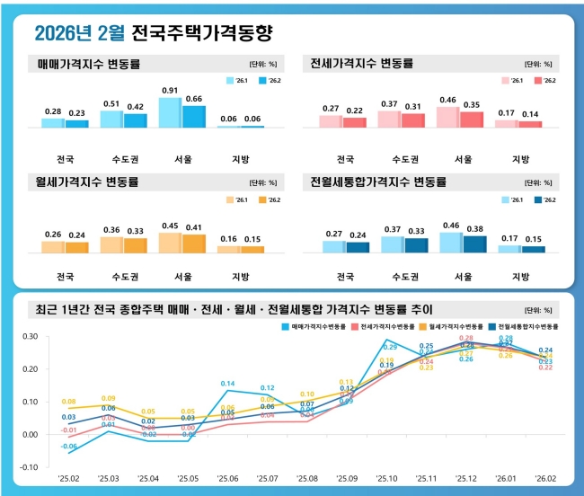한국부동산원이 발표한 ‘2026년 2월 전국 주택가격동향조사’에 따르면 전국 주택 매매가격은 전월 대비 0.23% 상승했다.