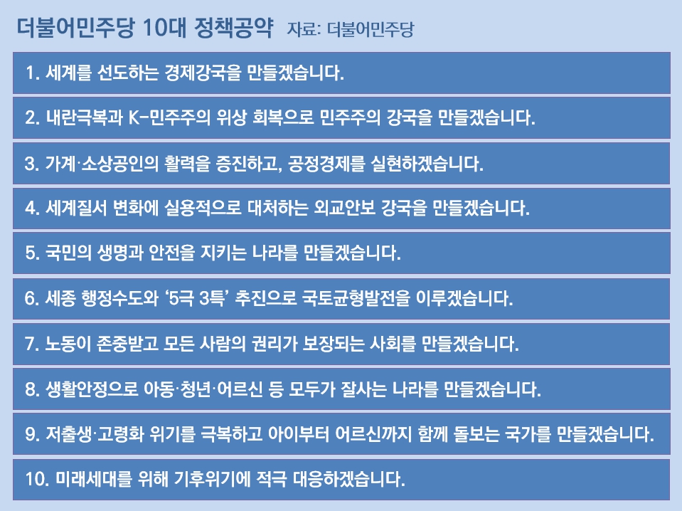 민주당은 내란 위기 극복을 통해 헌정질서를 ‘회복’하고 급변하는 대외환경, 저출생, 저성장을 극복하기 위한 경제 ‘성장’에 집중해 국민 모두가 ‘행복’한 삶을 살아갈 수 있는 ‘이제부터 진짜 대한민국’을 만들겠다고 밝혔다.